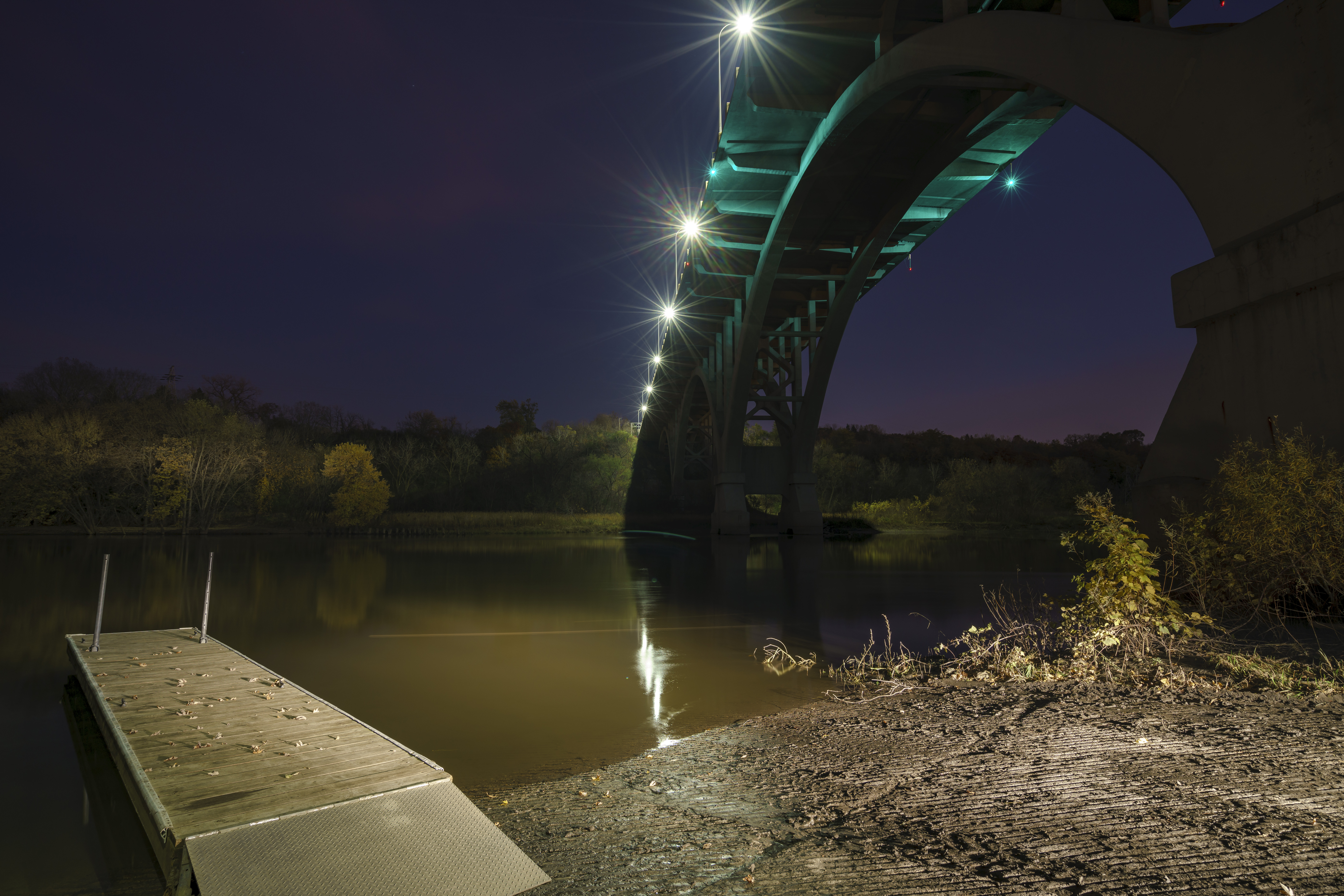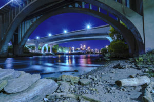 One part of my photography fun the last few years has been heading out at night with my friend and fellow photographer, Phil Ward, to capture shots around the Twin Cities. Phil is a chef (he and wife, Karen, run Black Cat Natural Foods and during the summer every Saturday are selling their yummy food at the Mill City Farmers’ Market, of which they are a founding vendor), as well as a limo driver. And while driving he seeks out the best locations around the cities, places we can take powerful photos. He’s a master at finding spots, which sometimes include a little work to get to.